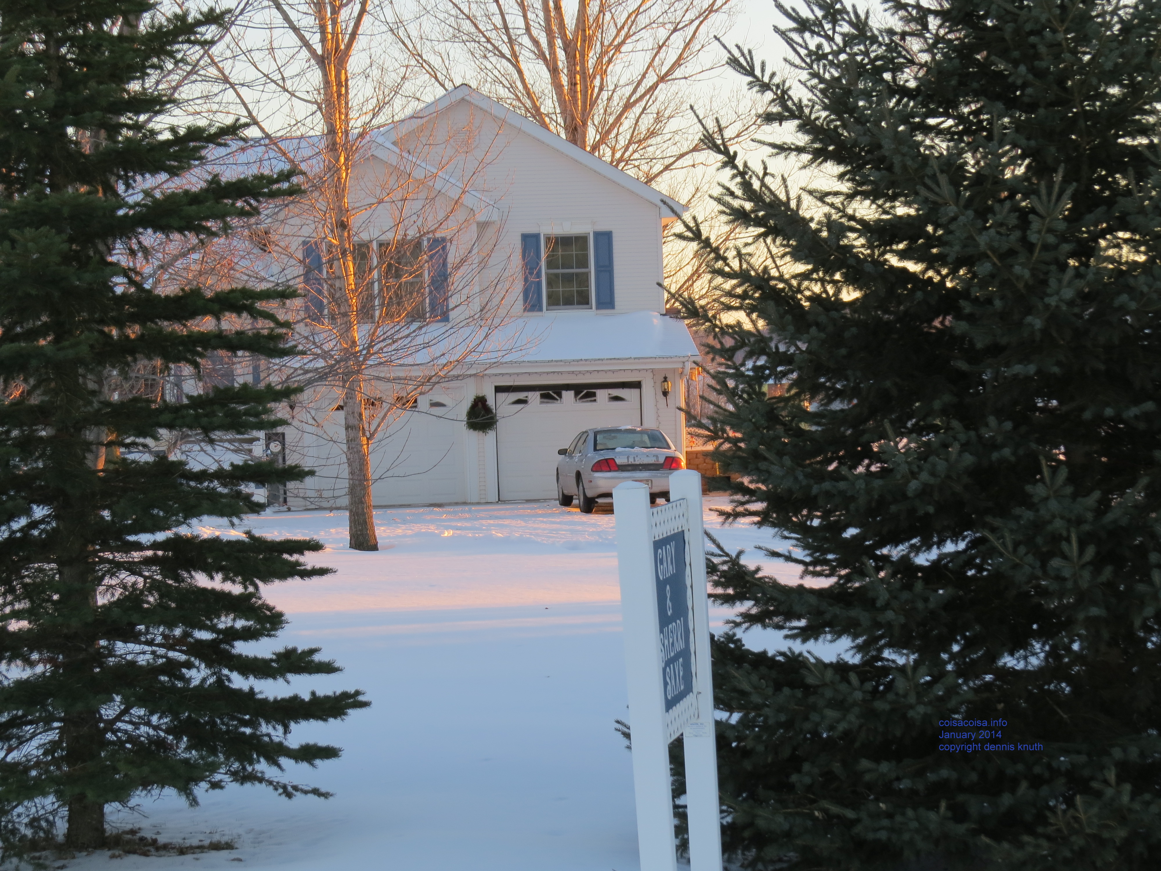 Gary and Sherri's house between the pine trees on a winter's evening
