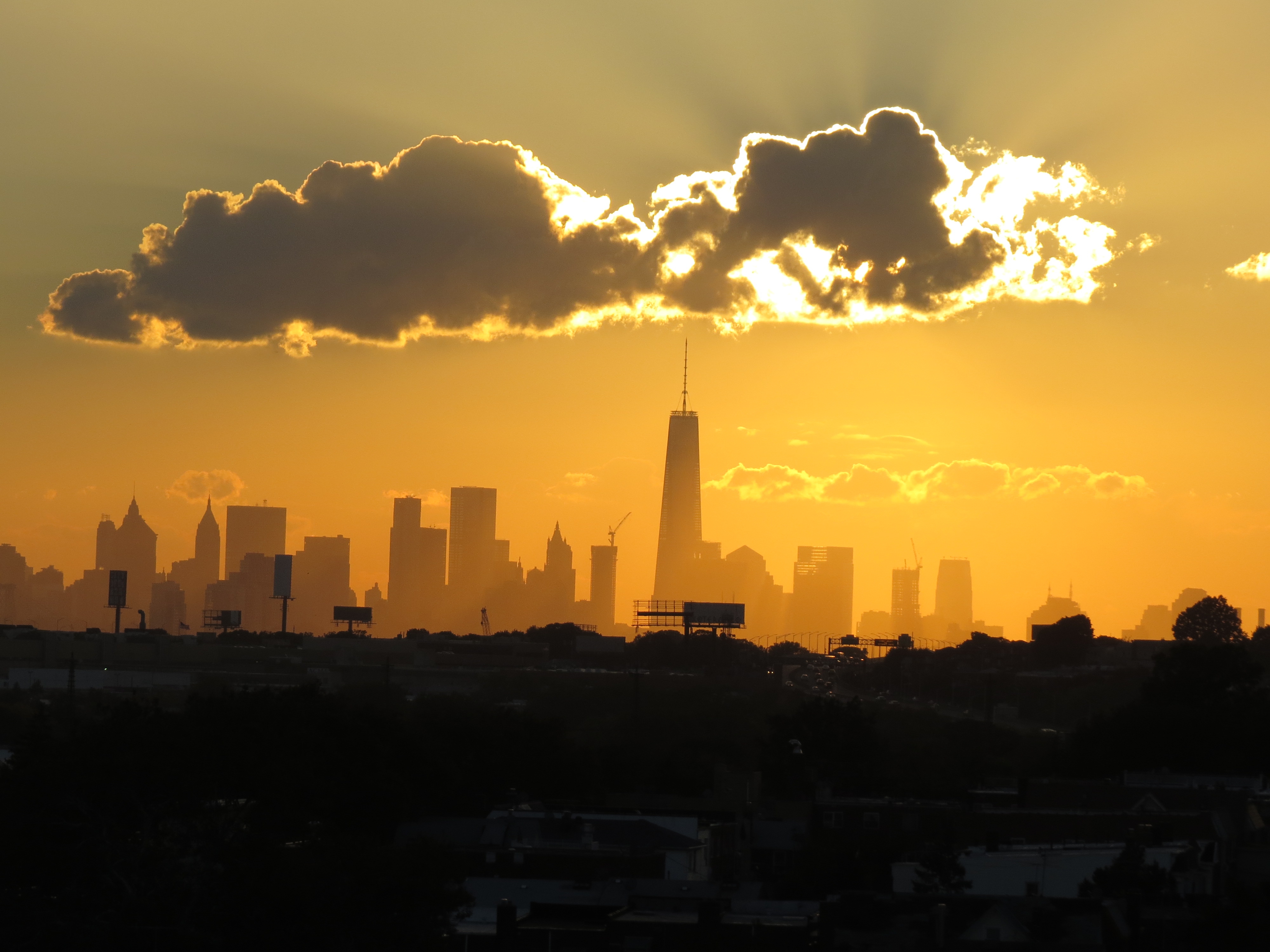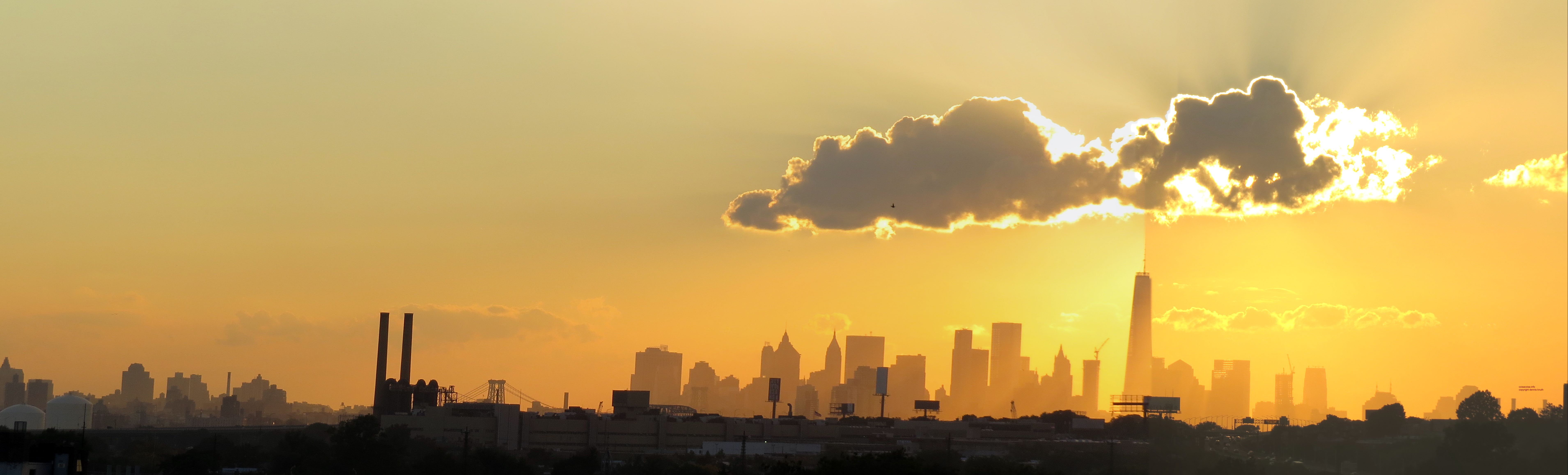 The sun is only in its same approximate position, vertically and horizontally, for a few days in October and February of each year. The relativity between the clouds, Queens / Manhattan and the sun is perfect The type of clouds are usual to summer but not so in the fall. The local sky is virtually clear except for the micro-climate formed clouds from the heat rising over Manhattan