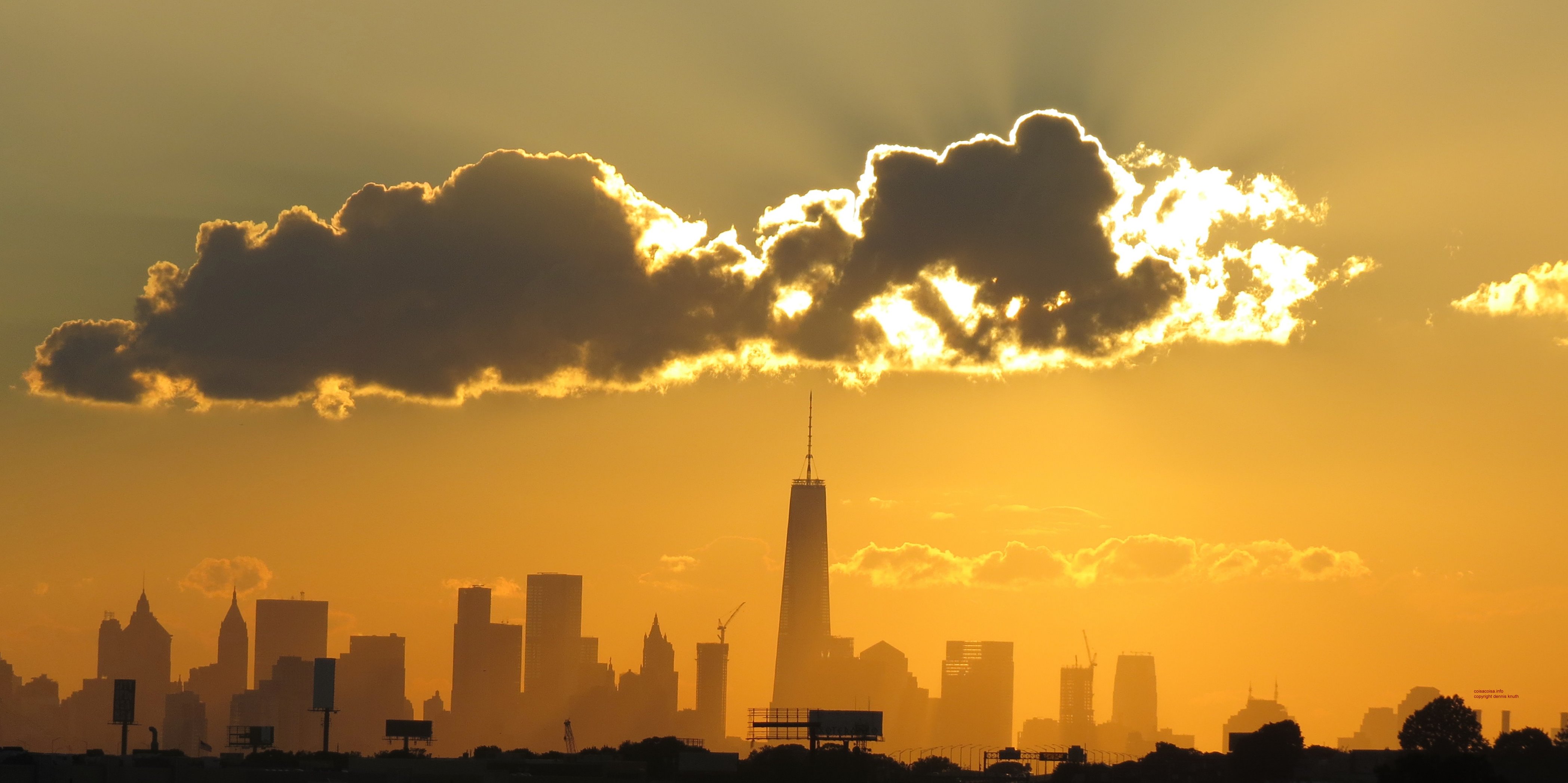 New Yorks Freedom Tower at Sunset. Photograph taken at about 5 pm on an Autumn day with the perfect sunset and the perfect clouds. The panorama reveals the clouds are formed by the heat rising above Manhattan. A New York Microclimate.